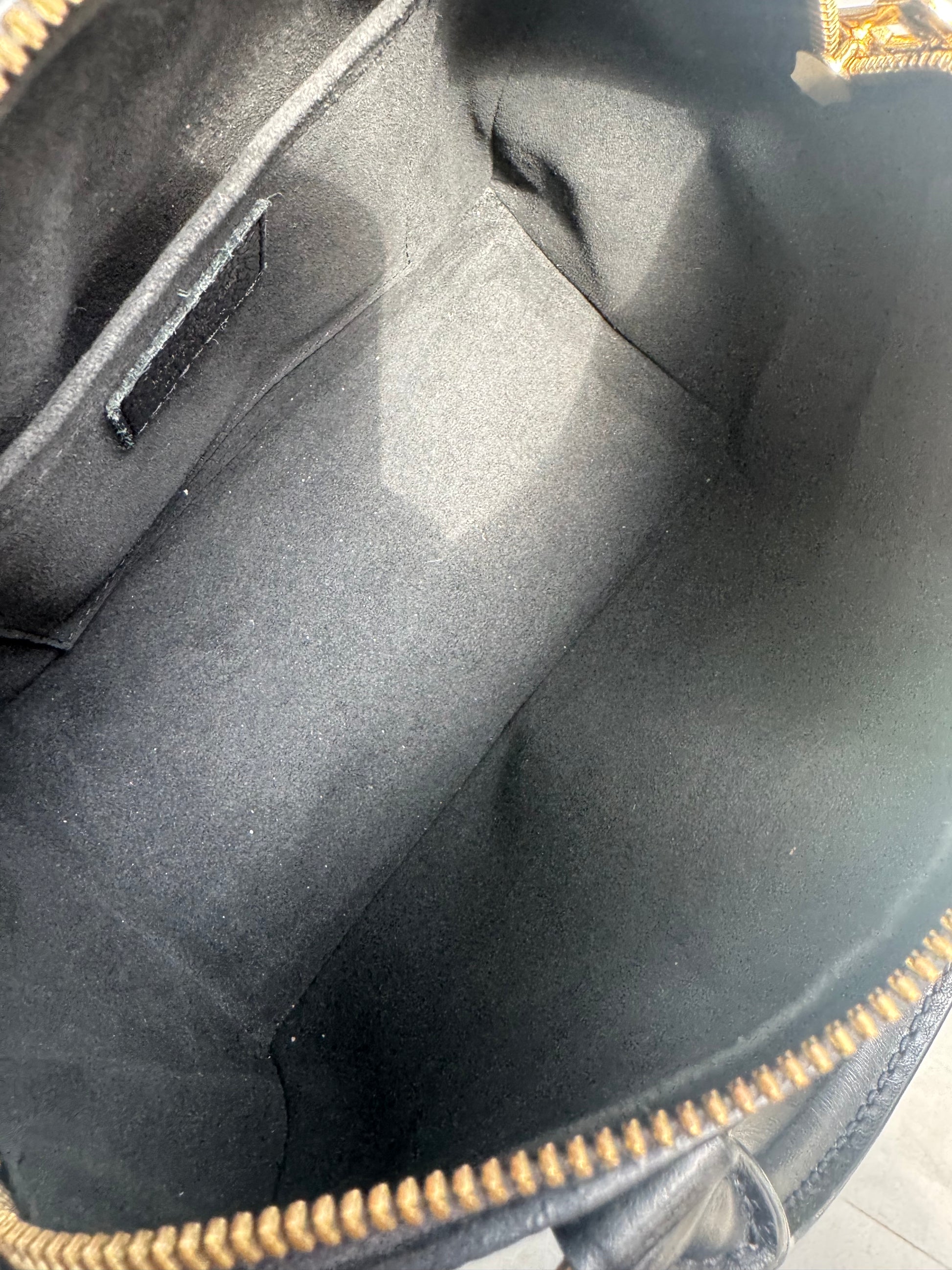 Very Good Condition. Exterior leather is beautiful calfskin leather with inevitable softening due to use. Interior is clean. No smell. Strap is in very good condition, chain is still gold. Minor fading/ wear on the d-rings and zipper.