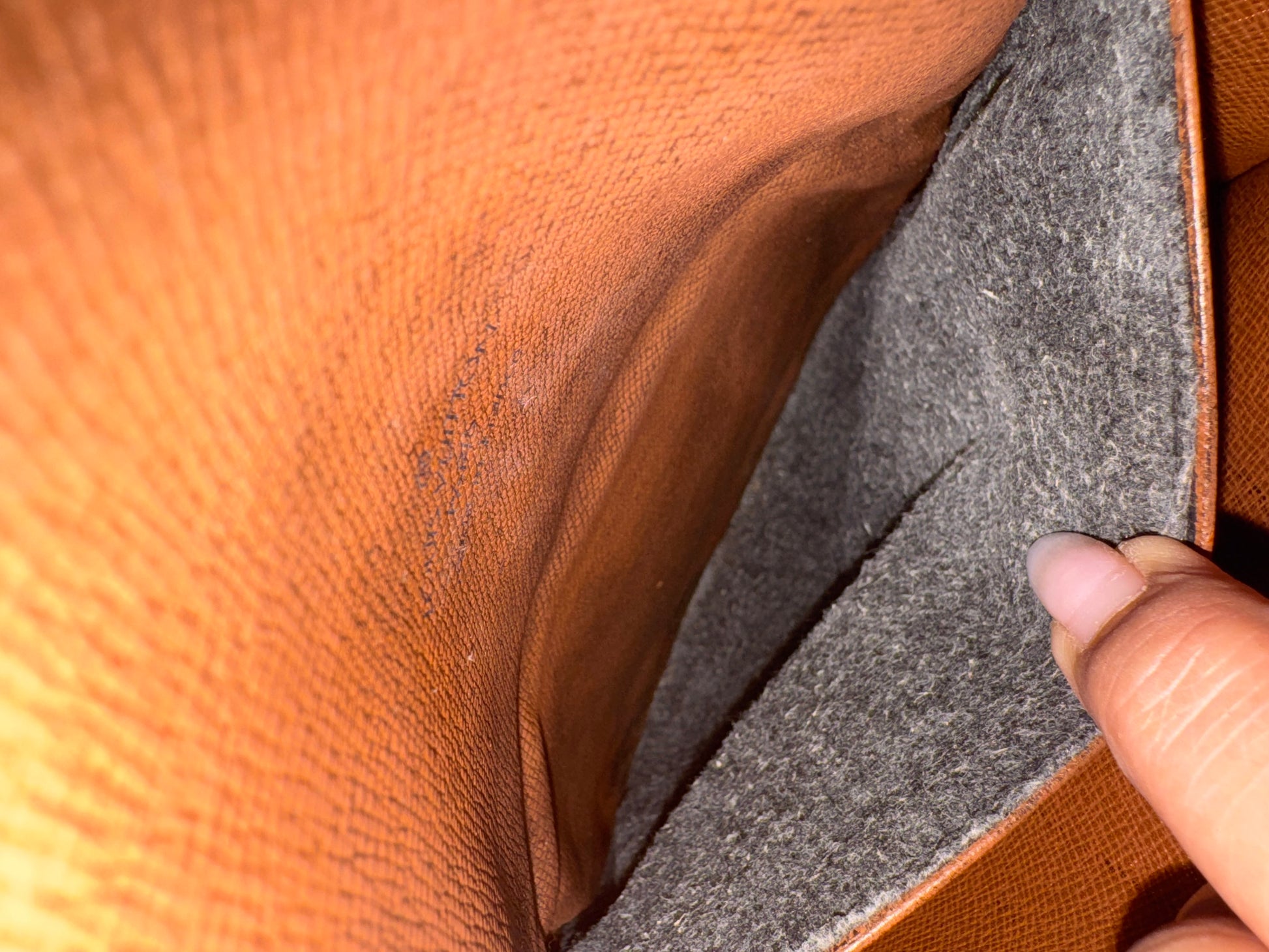 Clean. No stickiness. Strap has beautiful even honey patina. Hardwares are still gold and shiny with hairlines.
